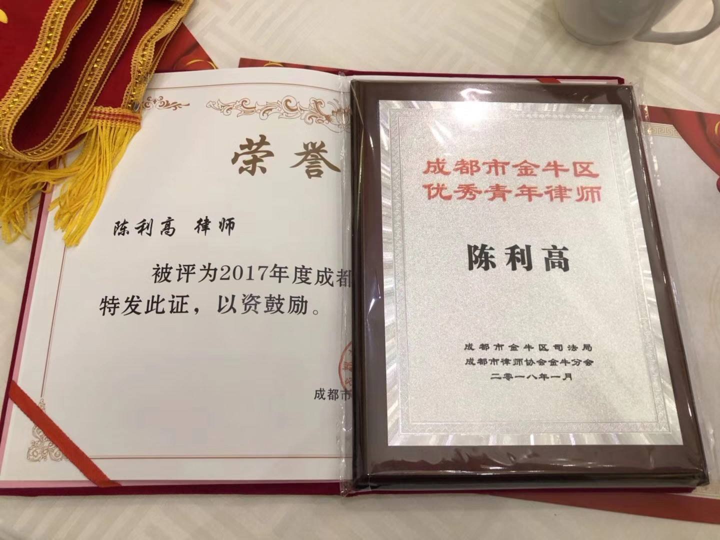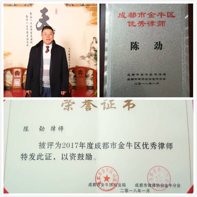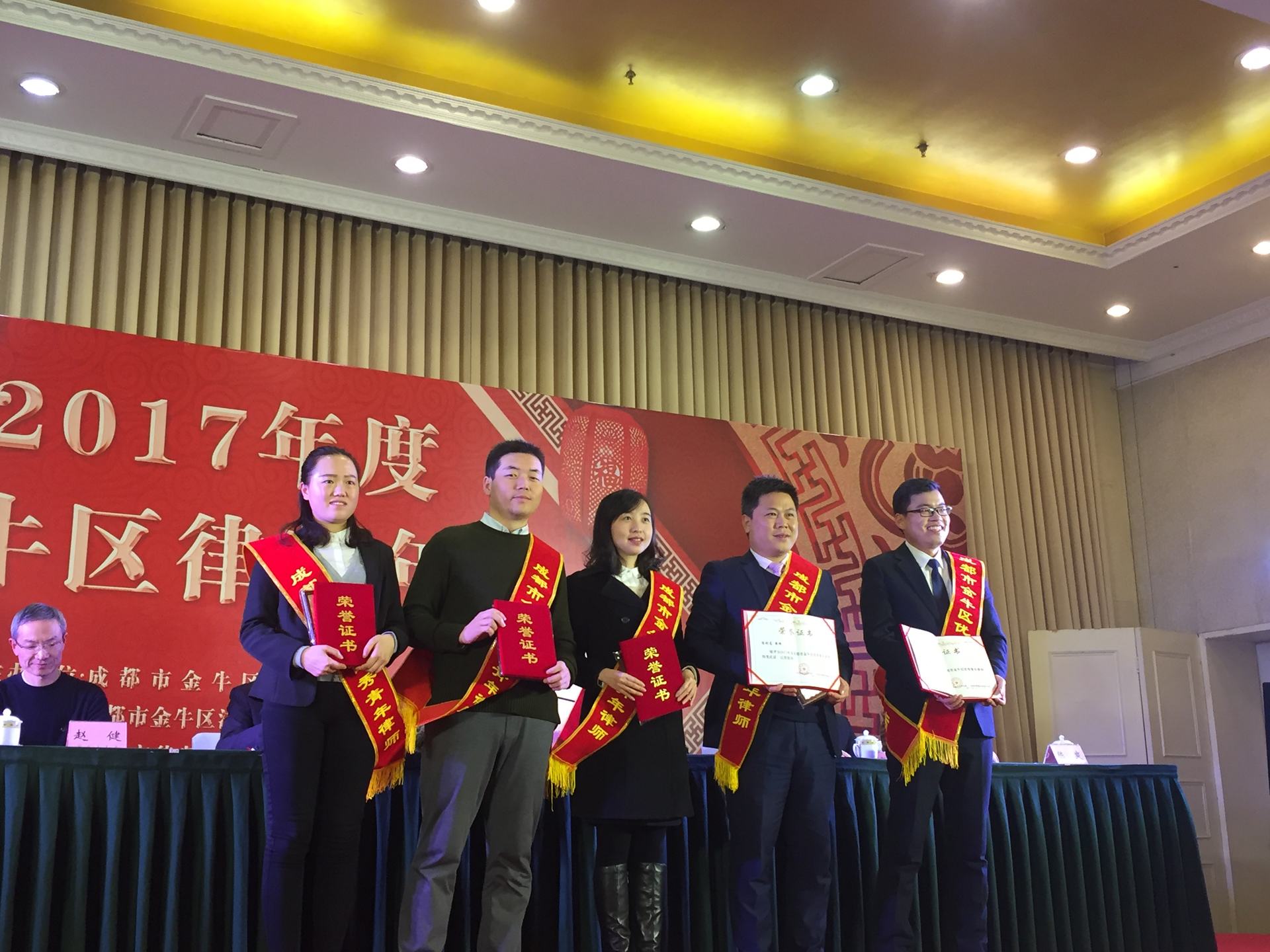 会上,金牛区分会领导颁发了2017年度“优秀律师”及“优秀青年律师”荣誉证书和奖牌,我所陈利高主任获得““优秀青年律师”称号,我所陈劲副主任,合伙人何敬君律师获得“优秀律师”称号。以下为获奖图片。