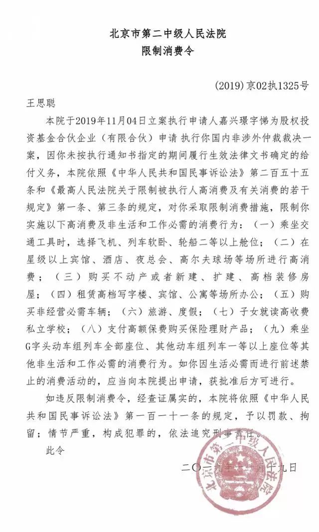 刚走出上海嘉定区人民法院的限制消费名单,王思聪再次收到限制消费令。中国执行信息公开网显示,北京市第二中级人民法院11月19日向王思聪发布了限制消费令。